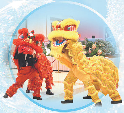 2月12日,亚布力山地媒体中心的舞狮表演。
